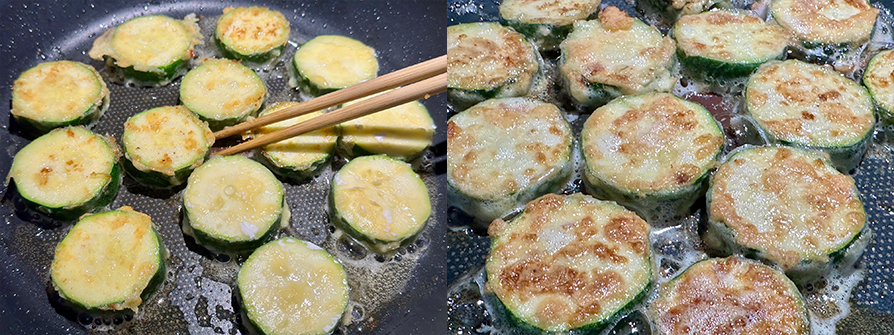 10.4分鐘後用筷子幫櫛瓜一一翻面,繼續不蓋鍋煎3分鐘,盛盤。再放剩下的櫛瓜再次下鍋煎,兩條櫛瓜煎2輪能完成。