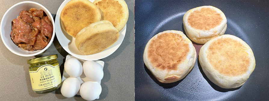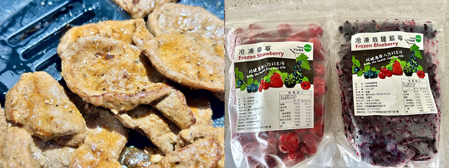 豬中里肌肉片400克、雞蛋4顆、樂朋鵝油2小匙、滿福堡3個、天時冷凍草莓12顆、天天冷凍藍莓5大匙