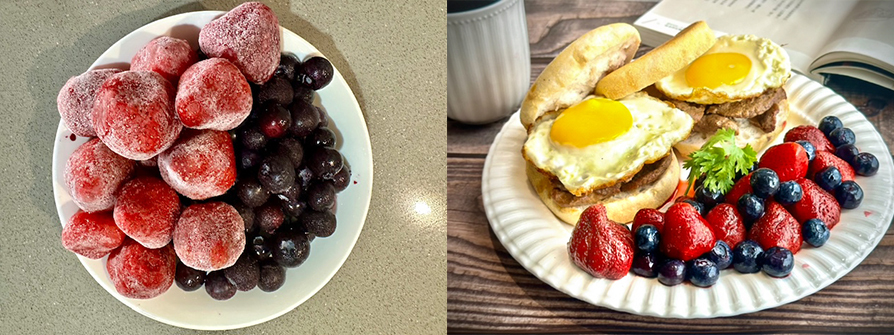8.最後裝盤時,再從冷凍取出曬太陽前的守護天使,冷凍藍莓是我用手機寫食譜的目睭守護神習慣也來一些。