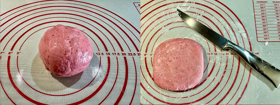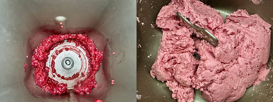 4.把地瓜粉分2-3次慢慢加進莓果泥中,一樣是攪拌模式打成莓果麵糰,麵糰顏色均勻即可,如果是用手揉可以把地瓜粉放盆裡加進莓果泥揉勻。