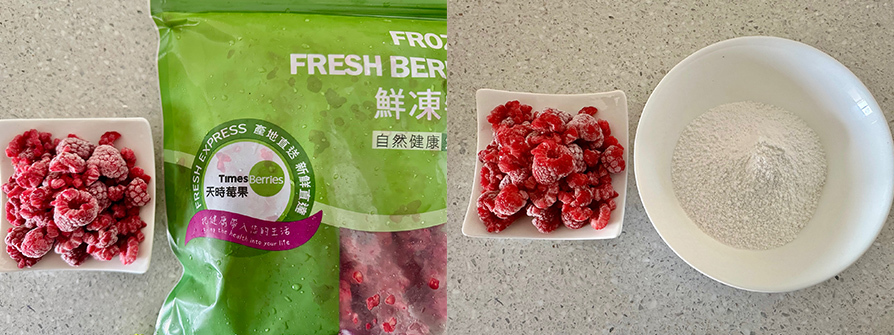 冷凍覆盆莓70克、地瓜粉70克、太白粉(手粉)10克
