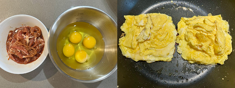 5.燒肉的做法:用煎蛋的原鍋再補1小匙油維持小火,將煎好的肉片均勻鋪好,豬肉變色後就翻面,這樣不厚的梅花豬肉片就煎好了。(小火煎肉能讓肉嫩不柴)