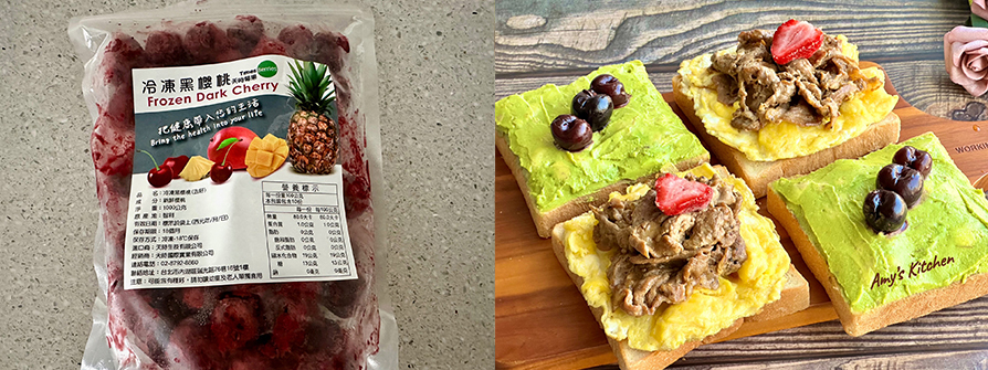 厚片吐司4片、梅花豬肉片6片、雞蛋4顆、冷凍酪梨250克、冷凍黑櫻桃6顆