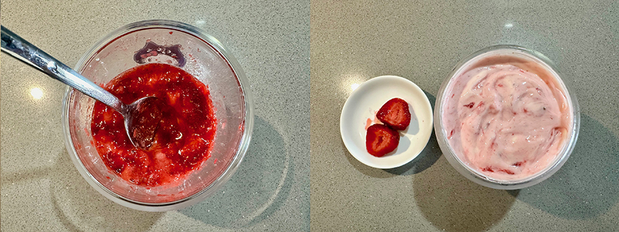 4.●再把無糖希臘優格用乾淨湯匙加進來,用攪泥的湯匙攪拌草莓泥跟優格,切一顆冷凍草莓當盤飾。