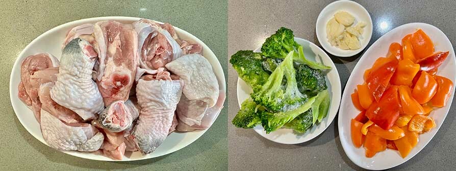 土雞腿3支、青花菜1/4顆、甜椒(小)3顆、蒜瓣4瓣、