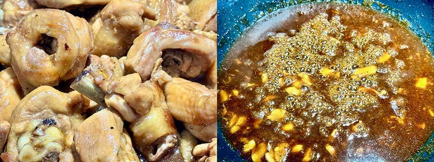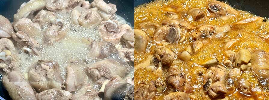 7.●4分鐘到打開鍋蓋翻炒一下,最後打開鍋蓋再燒煮1分鐘收汁讓雞腿能更巴附醬汁,土雞腿燒共煮了15分鐘已熟,熄火,雞腿先夾出。