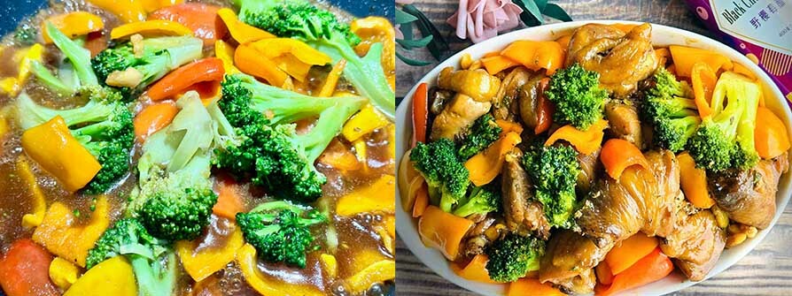 9.●把(甜椒塊)跟(青花菜)加進來翻炒,設定計時器蓋鍋燒煮2分鐘,打開鍋蓋翻炒一下,熄火,完成。