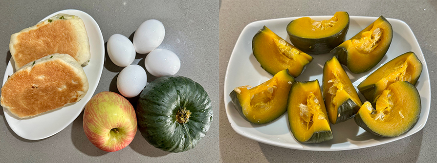雞蛋4顆、九層塔1/2手把、鹽1/6小匙、油2小匙、蔥餅現成的、貝貝南瓜1顆、富士蘋果1顆、冷凍黑莓20顆、冷凍覆盆莓20顆