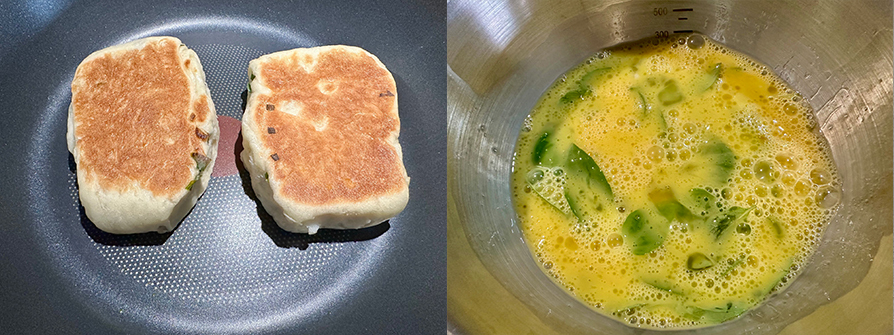 3.鍋子要煎蛋順便先烙餅的概念,蔥餅簡單回春可以這樣做,噴點淨水,鍋小火蓋鍋乾烙一面2分鐘水蒸煎軟,若沒要煎蛋,蔥餅可以放電鍋蒸。