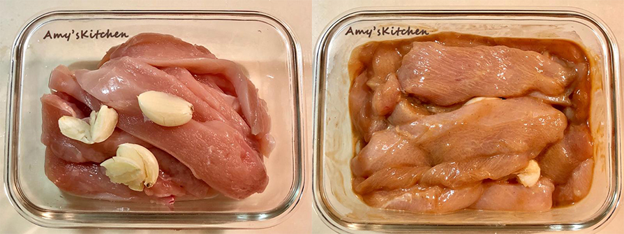雞胸肉切條狀,拍三顆蒜頭、撒胡椒粉,戴料理手套抓醃,淋上米酒、醬油,再次抓按讓雞柳吸醬料,再均勻撒上太白粉,醃製10分鐘。