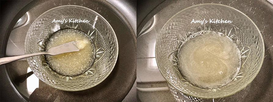 6.碗外加熱的水還沒滾,約2分鐘吉利丁粉就溶解啦