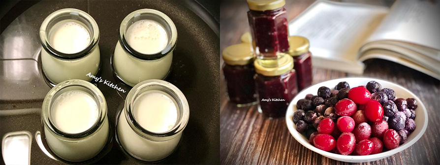 鮮奶 360cc、吉利丁粉 10克、水 40cc、鮮凍藍莓 200克、鮮凍蔓越莓 130克、鮮凍黑醋栗 170克、赤藻糖醇 75克