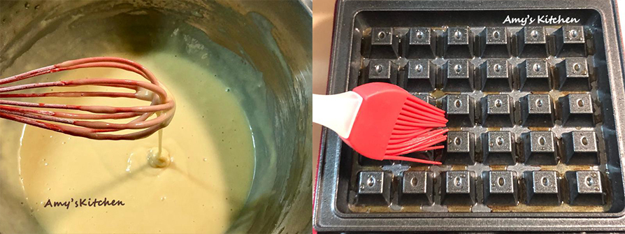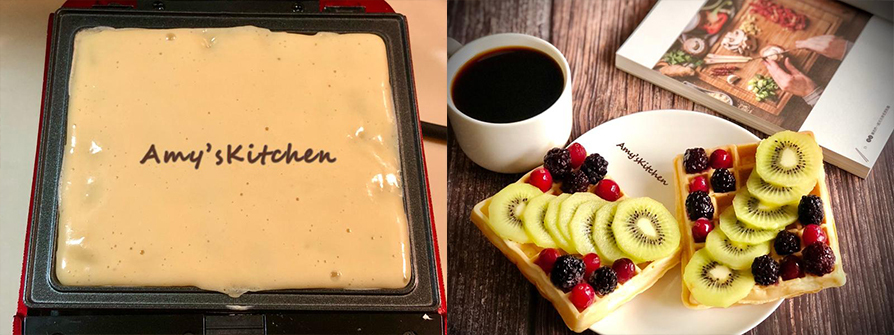 5.鬆餅機預熱後,從中間慢慢倒進麵糊。(這麵糊份量可以烤這樣大小鬆餅2片,人多依比例增加囉),麵糊倒進鬆餅機後,約1分鐘左右麵糊冒小泡泡後再蓋起來。(這樣麵糊略成型,烤完的鬆餅會比較美)