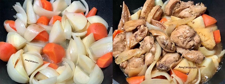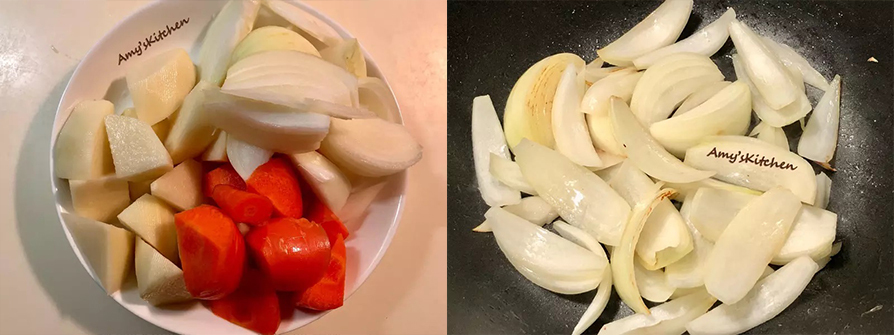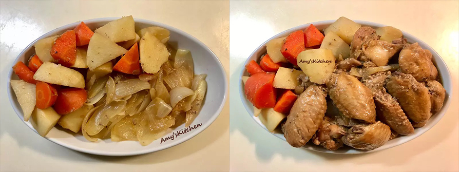 5.聞到洋蔥甜味後放進,馬鈴薯與紅蘿蔔,拌炒一下蓋鍋燒煮5分鐘,洋蔥、紅蘿蔔食材本身的水份,經燒煮自然釋出甘甜水份用來燒雞翅很棒