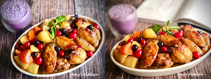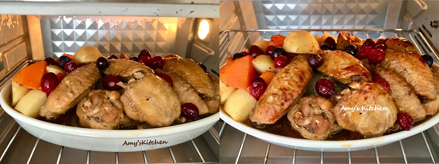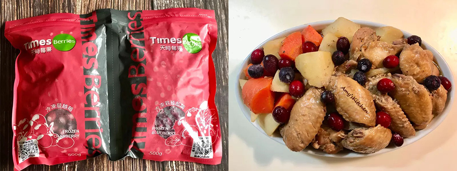 三節翅 5隻、紅蘿蔔 1根、洋蔥 1顆、馬鈴薯 1顆、冷凍蔓越莓 8-10顆、冷凍藍莓 8-10顆 油 1/2小匙