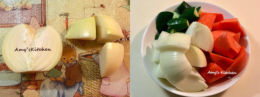 1.廚房角落剩一顆洋蔥,洋蔥剝膜後,切掉頭跟尾部,對半切再切塊。洋蔥舖底取洋蔥甜味當解膩配菜用,不用切太碎搭配雞腿吃才好吃