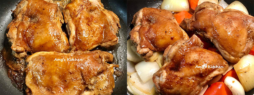 8.用雞腿煎香冒出的油脂加(洋蔥、紅蘿蔔塊)蓋鍋一起煎香。所有食材都熟了再放烤香烤莓果香氣喔