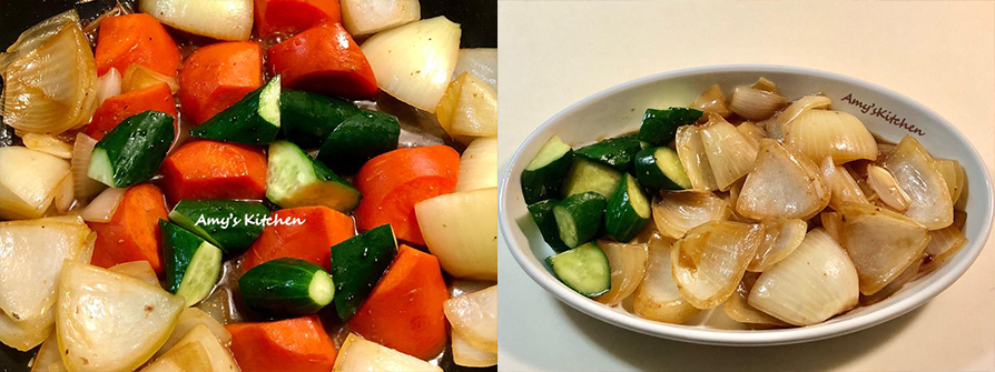 10.炒過的配菜(洋蔥先鋪底/再放小黃瓜)擺在能烤的瓷盤裡
