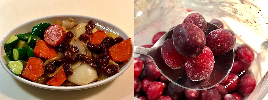 去骨雞腿排 3片、紅蘿蔔 2/3根、小黃瓜 1根、洋蔥 1顆、鮮凍黑櫻桃 3顆、鮮凍蔓越莓 10顆、鮮凍黑醋栗 10顆
