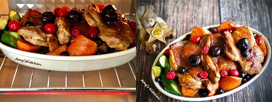 14.最後把煎熟的主角雞腿排,放到烤盤上淋上醃肉的醬汁,再加上黑櫻桃/蔓越莓/黑醋栗,加莓果烤過後提升烤雞腿的果香氣,也多了酸甜的好滋味。