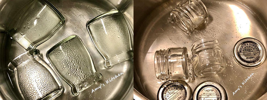 3.湯鍋燒水,水滾放玻璃罐煮沸約3分鐘,夾起瀝乾。