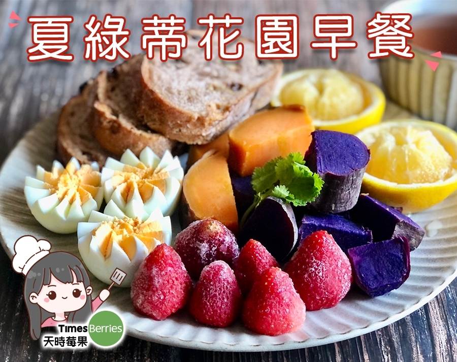 雜糧麵包3片、紫心地瓜1條、古坑柳丁2顆、地瓜1條、有機蛋3顆、冷凍草莓12顆
