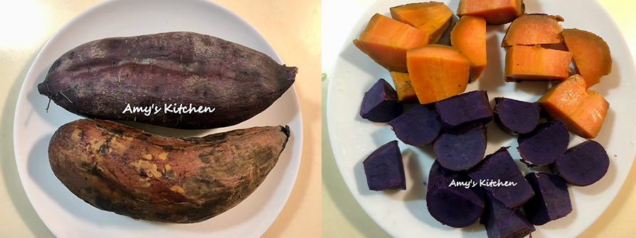 2.地瓜切掉兩端蒂頭,切方便吃的大小。(外皮刷洗很乾淨可以連皮吃,外皮黑黑的是被蟲偷吃過,切片時可以修掉)。