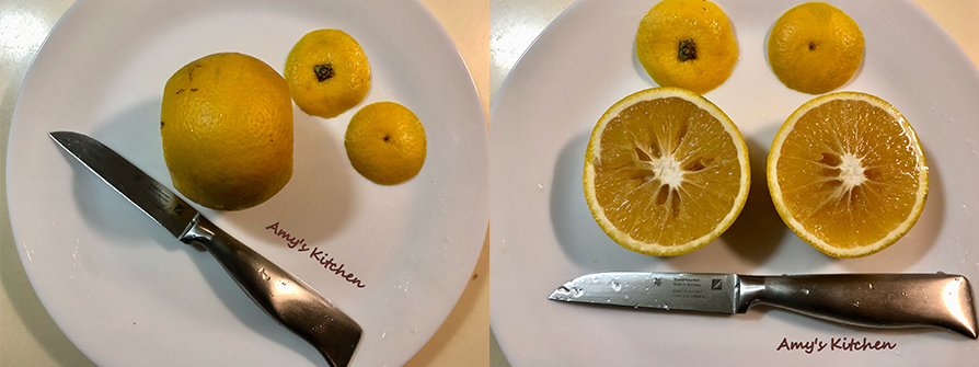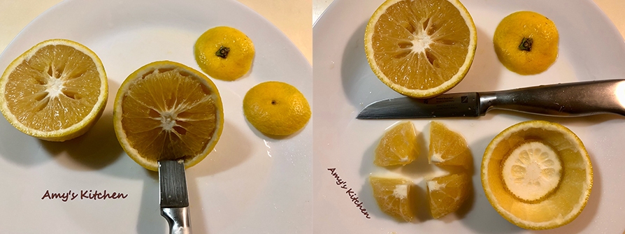 5.儀式感必須做整套的,古坑柳丁很甜很多汁,切成一口吃是不是更感人。柳丁洗淨切掉頭尾兩端。柳丁是地瓜阿伯最近賣的很甜很推。