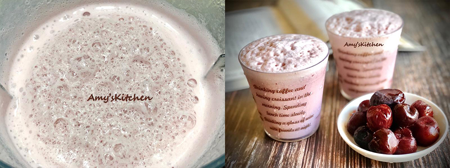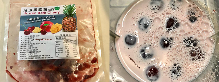 2.鮮凍黑櫻桃從冷凍取出跟鮮奶倒進果汁機裡