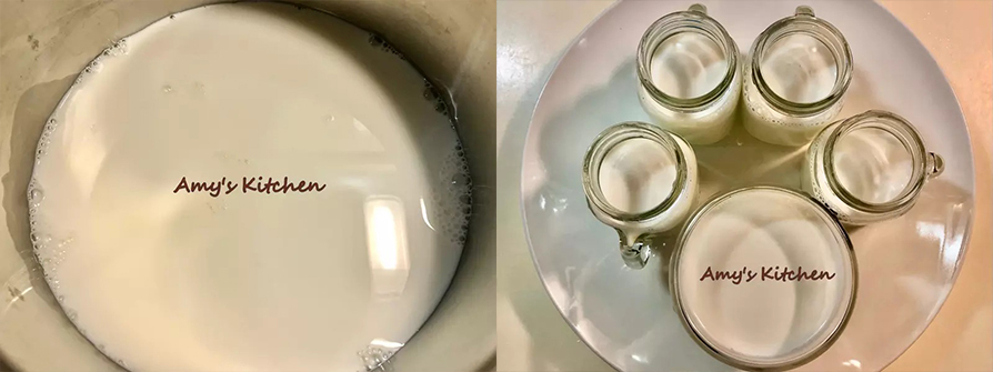 6.趁熱將鮮奶液,倒進汆燙消毒過的玻璃容器裡
