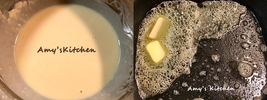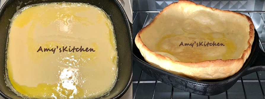 7.將麵糊倒進抹過奶油的鑄鐵盤中。(奶油會浮在上面沒關係,等等烤熟再用廚房紙巾吸油即可)
