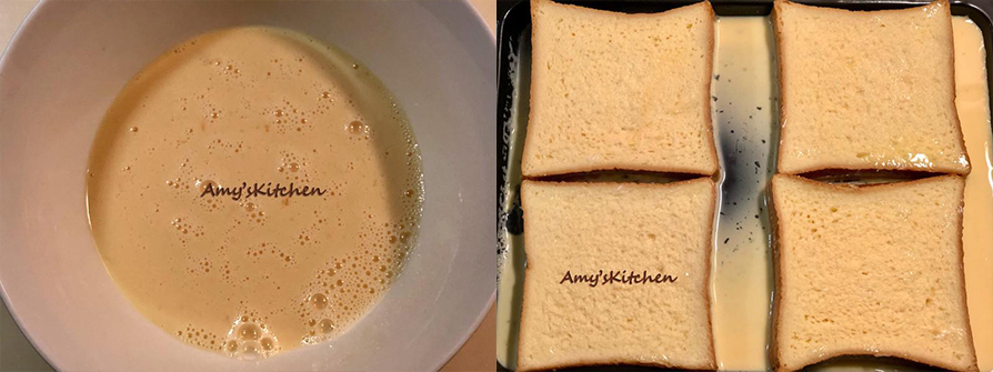 4.再來就是幫吐司泡澡15分鐘,設定計時器才不會忘記,今天要一次泡4片用烤箱的烤盤洗淨擦乾,倒進鮮奶蛋汁放上吐司,約30秒用平面的炒匙小心幫吐司翻面,讓吐司兩面都均勻吸滿鮮奶蛋汁,這樣的法式吐司才美味喔