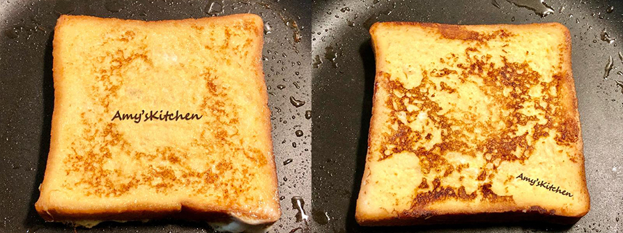 7.用平匙小心地從盤中剷出,已泡到白泡泡的吐司到鍋中,蓋鍋煎2分鐘,蓋鍋能讓吐司肚子裡的鮮奶蛋汁快熟,也不會因為久煎醜掉