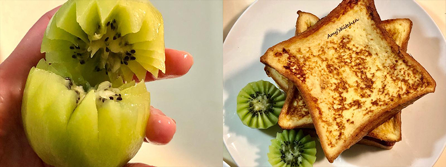 11.煎吐司的時間我們來準備水果,今天分享常被問用甚麼模具切奇異果🥝切法:奇異果洗淨切掉頭尾兩端蒂頭後削皮,左手拿奇異果右手拿小刀,在奇異果的肚子劃一圈山字,就如照片這樣,沒模具沒毛病
