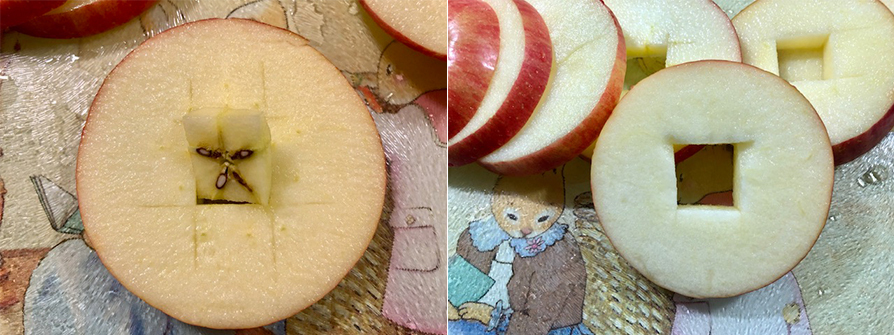 3.華盛頓蘋果很脆甜香氣也好,洗淨後橫切切六片剛好也是吉利數字,每片蘋果可以用小刀沿中心果核如照片畫井字後取下果核。
