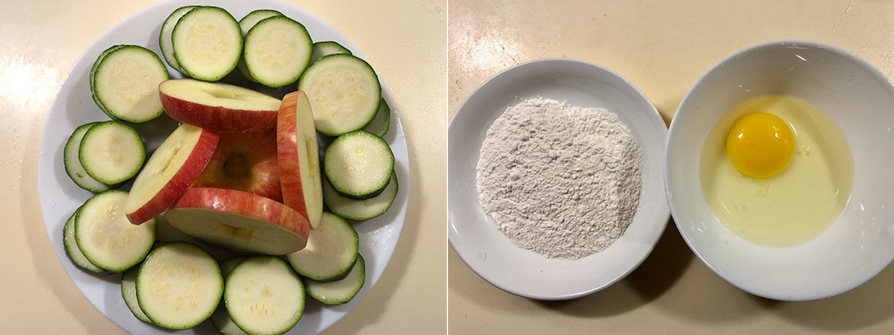華盛頓富士蘋果1顆、櫛瓜2條、麵粉(低中高粉都可)2.5大匙、雞蛋2顆、鹽1/3小匙、白胡椒粉1/2小匙、油1.5大匙、野櫻莓果醋(沾醬)1.5大匙、