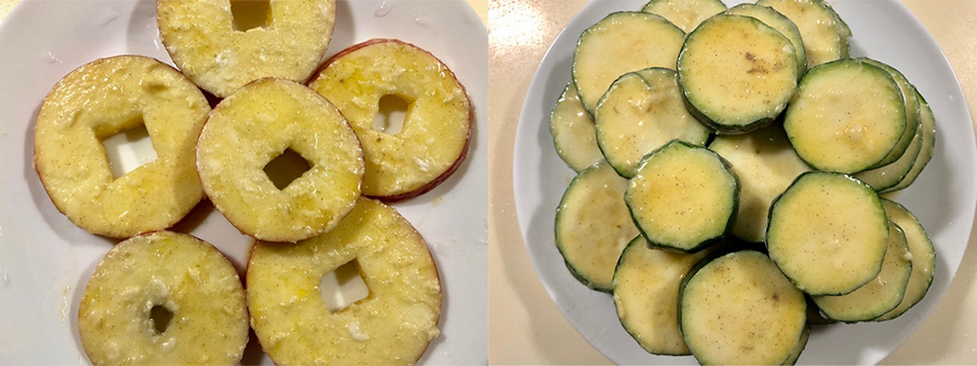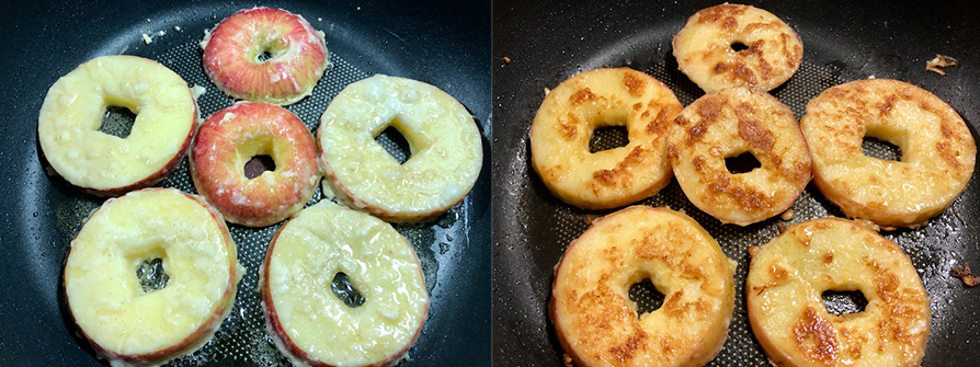 12.4分鐘後用筷子幫蘋果們翻面,繼續不蓋鍋煎3分鐘,煎蘋果的時間可以用來櫛瓜擺盤,蘋果煎好櫛瓜也擺好,蘋果片可以直接像金幣一樣立著閃亮登場。