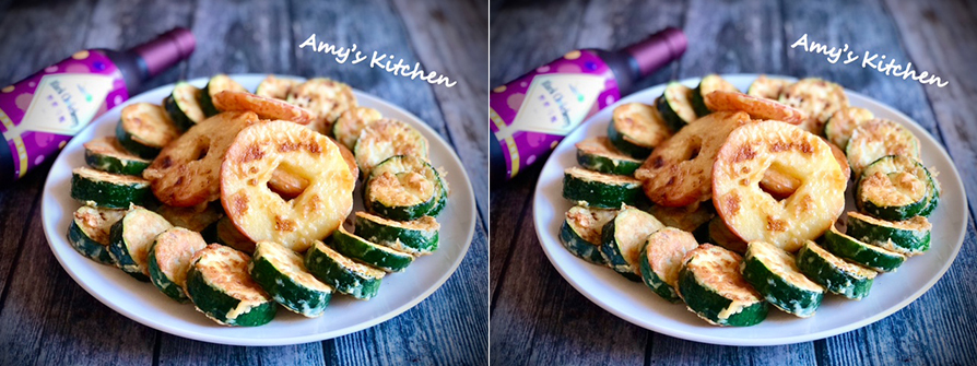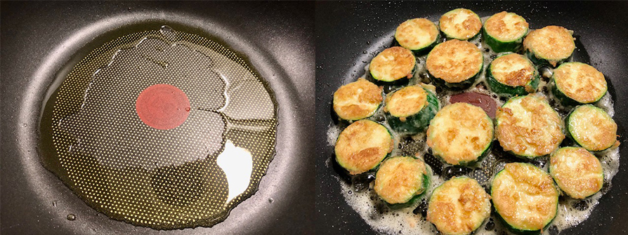 10.鍋熱均勻擺上櫛瓜片設定計時器4分鐘,蛋煎櫛瓜不蓋鍋煎這樣櫛瓜才會酥,4分鐘後用筷子幫櫛瓜一一翻面,繼續不蓋鍋煎3分鐘,櫛瓜盛盤一片片斜立著,讓櫛瓜不直接貼盤面反潮影響口感。