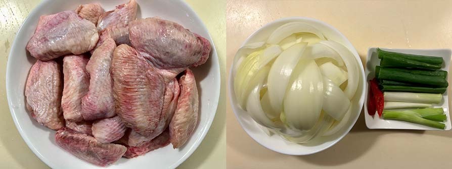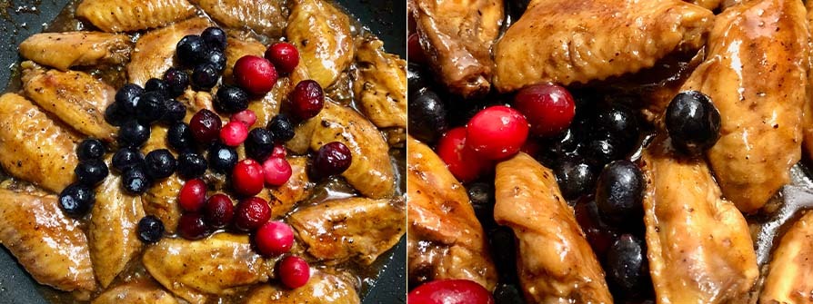 胖胖翅20支、洋蔥1顆、青蔥1根、黑胡椒粒1/3小匙、油2小匙、天時冷凍藍莓1.5大匙、天時冷凍蔓越莓1.5大匙、