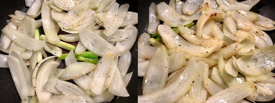 6.洋蔥炒6分鐘的模樣開始軟化轉褐色,再翻炒均勻,熄火。
