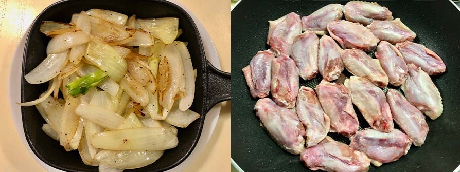 8.用炒洋蔥原鍋補上1小匙油,均勻擺上雞翅,設定計時器蓋鍋煎6分鐘。