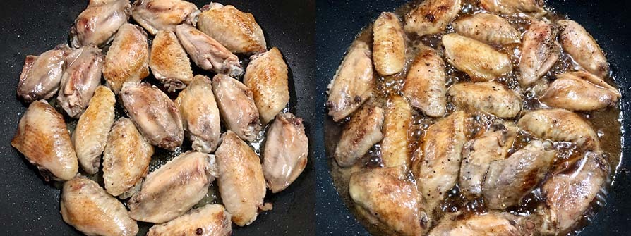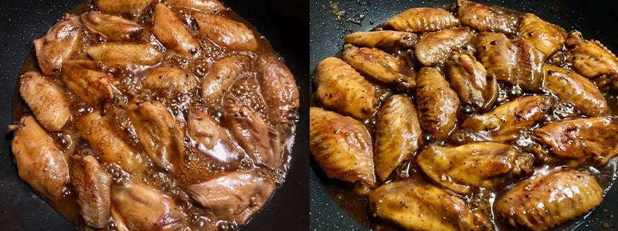 12.胖胖翅煎+燒12分鐘已熟透,再來打開鍋燒煮至收汁,這樣能讓果醋醬汁更緊緊包附在胖胖翅上更好吃,時間約5分鐘。