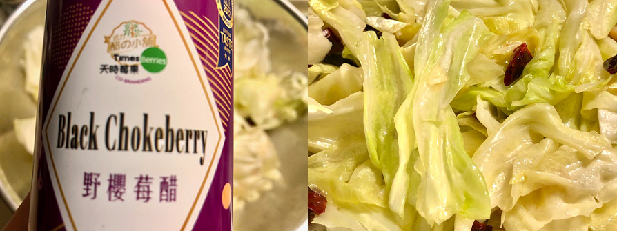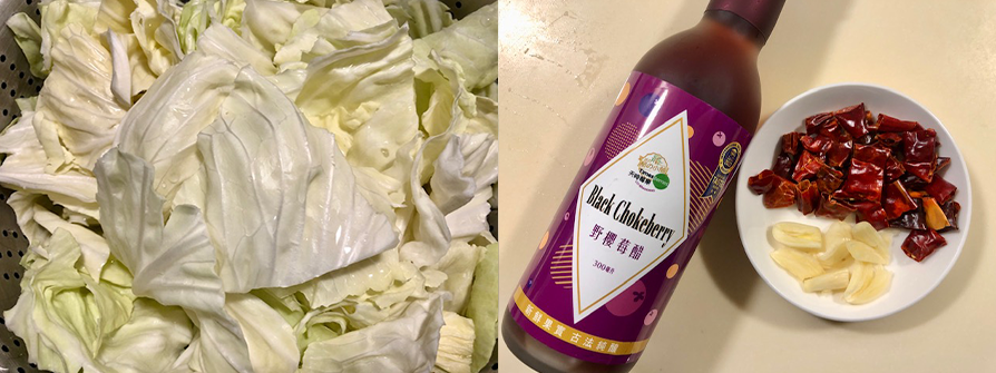 高麗菜1/3顆、蒜瓣3瓣、乾辣椒1/2大匙、鹽1/3小匙、天時野櫻莓果醋1.5大匙