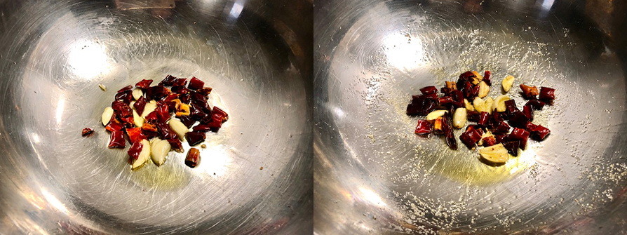 3.把乾辣椒跟蒜末放到鍋中煸出香氣。