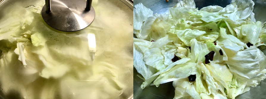 5.把高麗菜捧進鍋中,先蓋鍋蒸炒3分鐘。