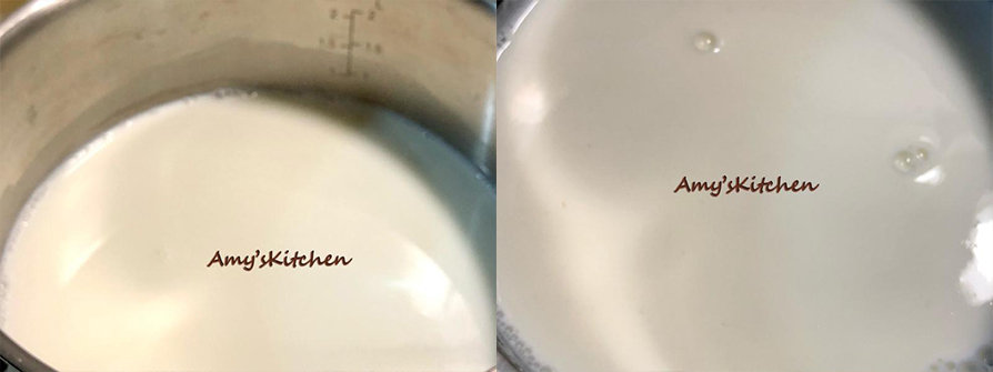 5.用不鏽鋼鍋倒進(鮮奶)小火煮5分鐘。(今天要搭台灣芒果吃鮮奶酪,愛文芒果很甜鮮奶酪沒加糖,若要加堅果或鮮奶酪單獨吃,可以加糖一起煮鮮奶,若希望有香草香味也可以加香草進來)