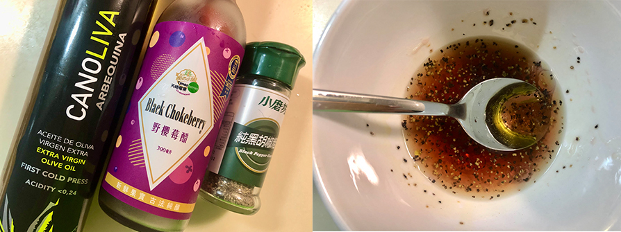 1.油醋醬用家裡習慣飲用的純釀果醋+橄欖油+黑胡椒粒+鹽。