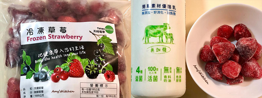 2.優酪乳選習慣喝或方便買的,喜歡有甜味可選含糖的。冷凍草莓要打果汁時再從冷凍取即可