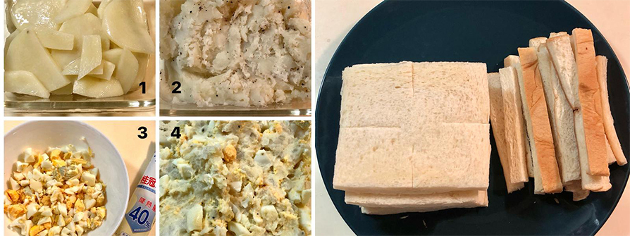 蛋蒸熟剝殼後切碎加上沙拉醬跟薯泥拌勻。