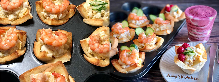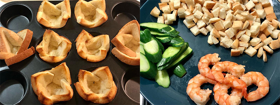7.杯子烤好了,先加幾顆吐司邊丁,再把馬鈴薯沙拉挖到吐司杯裡,每杯放一隻鮮蝦跟兩片小黃瓜,做幾個莓果口味的解解膩。